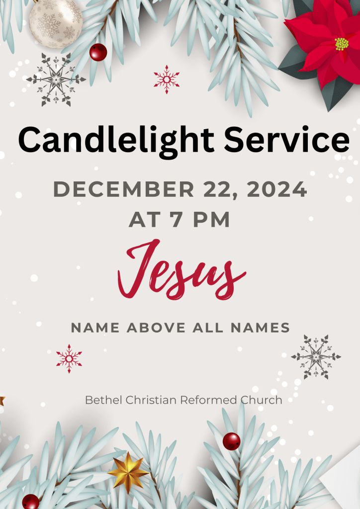 LIVESTREAM and IN PERSON This Sunday afternoon evening, December 22, 2024 at Bethel Dunnville we enjoy our Annual Candlelight Service. Join us for readings, special music, singing, and a joyous worship celebration. We would like to follow this service with a time of fellowship and refreshments. We will be having regular and decaf coffee, tea, and warm apple cider (yum) along with homemade baked goods. Join us at 7 p.m. in person or on our YouTube Channel: https://www.youtube.com/channel/UCZbo9nvMfvfKQsFRTBzDx7